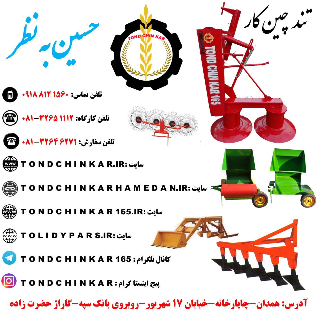 ادرس:همدان - چاپارخانه - خیابان 17 شهریور- روبروی بانک سپه - گاراژ حضرت زاده - حسین به نظر
